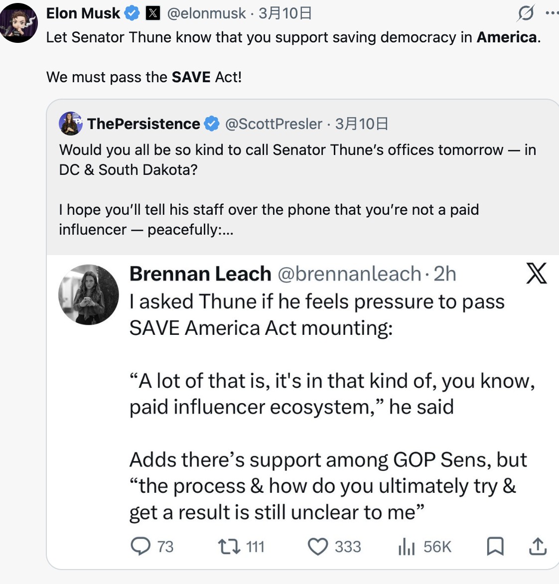 2026年3月10日、イーロン・マスク氏はX上で、再び強いメッセージを発信しました。「Senator Thuneに、アメリカの民主主義を守るためにSAVE Actを支持していることを伝えよう。私たちはSAVE Actを可決しなければならない!」